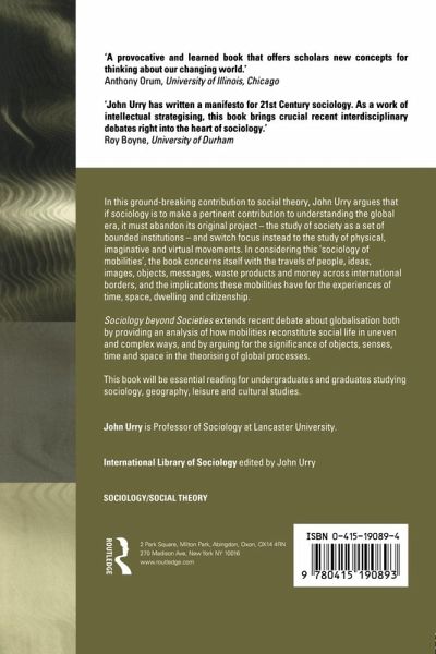 In this ground-breaking contribution to social theory, John Urry argues that the traditional basis of sociology - the study of society - is outmoded in an increasingly borderless world. If sociology is to make a pertinent contribution to the post societal era it must forget the social rigidities of the pre-global order and, instead, switch its focus to the study of both physical and virtual movement. In considering this sociology of mobilities, the book concerns itself with the travels of people, ideas, images, messages, waste products and money across international borders, and the implications these mobilities have to our experiences of time, space, dwelling and citizenship. Sociology Beyond Society extends recent debate about globalisation both by providing an analysis of how mobilities reconstitute social life in uneven and complex ways, and by arguing for the significance of objects, senses, and time and space in the theorising of contemporary life. This book will be essential reading for undergraduates and graduates studying sociology and cultural geography.