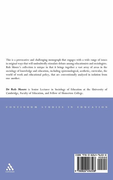 This is a provocative and challenging monograph that engages with a wide range of issues in original ways and will undoubtedly stiumlate debate among educationists. Rob Moore's collection is unique in that it brings together a range of areas in the sociology of knowledge and education (epistemological, aesthetic, curricular, the world of work, educational policy) that are concentionally analysed in isolation from one another.