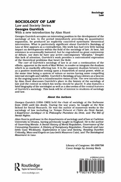 Georges Gurvitch occupies an interesting position in the development of the sociology of law. In the period immediately preceding its quantitative expansion, he produced an explicitly conceived systematic theoretical intervention. What is particularly significant about Gurvitch's Sociology of Law at first appears as a contradiction. His work has had very little lasting impact on developments within the field of the sociology of law. At best, his existence is occasionally footnoted, but he engendered no great controversy or debate, nor does he have any active contemporary "disciples." Despite this lack of attention, Gurvitch work provides a concentrated expression of the theoretical problems that beset the field. The core of Gurvitch's sociology of law is at root a continuation of the efforts, apparent in the work of Max Weber, to resolve or integrate the dualism which is so markedly affecting law. It is the apparent dualism between law as a positive institution resting upon a framework of social power, while at the same time being a system of values or norms having some compelling internal strength and validity. Gurvitch's Sociology of Law shines as a beacon in the ongoing quest for a transformative vision of law. The new introduction by Alan Hunt discusses Gurvitch's place in the history of the sociology of law and the context in which his works should be placed. It also features a brief biography of the sociologist as well as a discussion of the central features of Gurvitch's sociology. This book will be of interest to students of sociology and law.