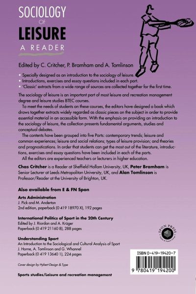 The sociology of leisure is an important part of most leisure and recreation management degree and leisure studies BTEC courses. This book is designed to provide essential material in an accessible form for students. It draws together 24 classic readings which provide comprehensive coverage of key conceptual debates in the sociology of leisure.