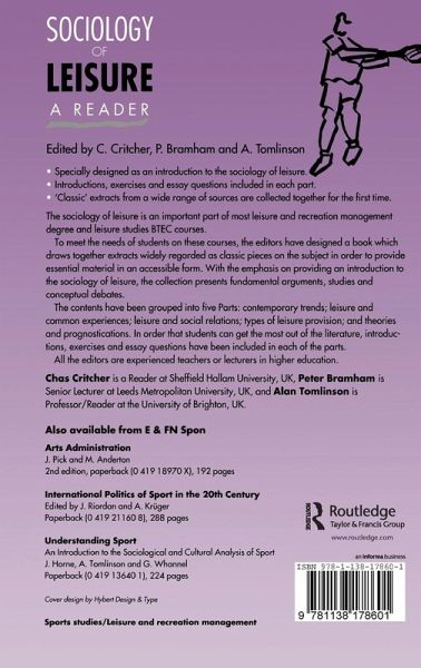 The sociology of leisure is an important part of most leisure and recreation management degree and leisure studies BTEC courses. This book is designed to provide essential material in an accessible form for students. It draws together 24 classic readings which provide comprehensive coverage of key conceptual debates in the sociology of leisure.