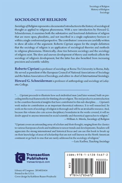 Sociology of Religion represents a documented introduction to the history of sociological thought as applied to religious phenomena. It examines both the substantive and functional definitions of religion that are more open, pluralistic, and not inscribed in a single explanatory horizon or within a single confessional perspective. The contributors' concerns are carefully written to show all sides of the argument. Roberto Cipriani argues for the simple definition that the sociology of religion is an application of sociological theories and methods to religious phenomena. Historically, close ties between sociology and the sociology of religion exist. The slow and uneven development of theory and methods affects the sociology of religion's development, but the latter has also benefited from increasing precision and scientific validity. Other sociological writers agree and disagree about different approaches. Some assume it is a militantly confessional or anti-confessional; others remain neutral within their work.