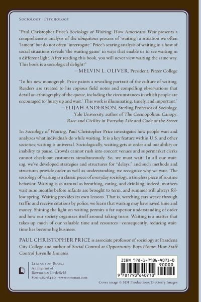 In Sociology of Waiting, Paul Christopher Price investigates how people wait and analyzes what individuals do while waiting. Shining the light on waiting permits a far superior understanding of order, first come-first serve, and how society organizes itself around taking turns. Waiting gets at our ability or inability to pause and consider others.