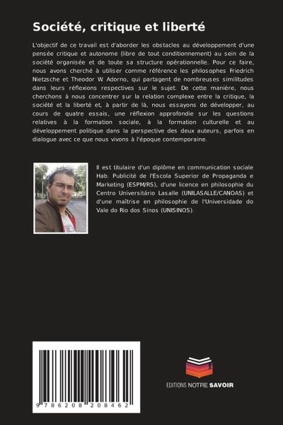 L'objectif de ce travail est d'aborder les obstacles au développement d'une pensée critique et autonome (libre de tout conditionnement) au sein de la société organisée et de toute sa structure opérationnelle. Pour ce faire, nous avons cherché à utiliser comme référence les philosophes Friedrich Nietzsche et Theodor W. Adorno, qui partagent de nombreuses similitudes dans leurs réflexions respectives sur le sujet. De cette manière, nous cherchons à nous concentrer sur la relation complexe entre la critique, la société et la liberté et, à partir de là, nous essayons de développer, au cours de quatre essais, une réflexion approfondie sur les questions relatives à la formation sociale, à la formation culturelle et au développement politique dans la perspective des deux auteurs, parfois en dialogue avec ce que nous vivons à l'époque contemporaine.