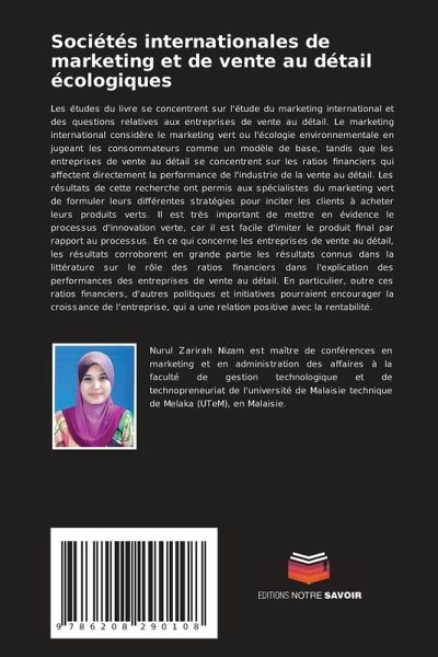 Les études du livre se concentrent sur l'étude du marketing international et des questions relatives aux entreprises de vente au détail. Le marketing international considère le marketing vert ou l'écologie environnementale en jugeant les consommateurs comme un modèle de base, tandis que les entreprises de vente au détail se concentrent sur les ratios financiers qui affectent directement la performance de l'industrie de la vente au détail. Les résultats de cette recherche ont permis aux spécialistes du marketing vert de formuler leurs différentes stratégies pour inciter les clients à acheter leurs produits verts. Il est très important de mettre en évidence le processus d'innovation verte, car il est facile d'imiter le produit final par rapport au processus. En ce qui concerne les entreprises de vente au détail, les résultats corroborent en grande partie les résultats connus dans la littérature sur le rôle des ratios financiers dans l'explication des performances des entreprises de vente au détail. En particulier, outre ces ratios financiers, d'autres politiques et initiatives pourraient encourager la croissance de l'entreprise, qui a une relation positive avec la rentabilité.