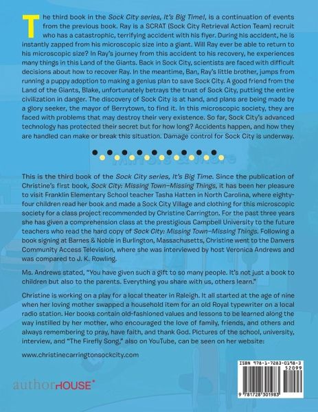 This is the third book of the Sock City series, It's Big Time. Since the publication of Christine's first book, Sock City: Missing Town-Missing Things, it has been her pleasure to visit Franklin Elementary School teacher Tasha Hatten in North Carolina, where eighty-four children read her book and made a Sock City Village and clothing for this microscopic society for a class project recommended by Christine Carrington. For the past three years she has given a comprehension class at the prestigious Campbell University to the future teachers who read the hard copy of Sock City: Missing Town-Missing Things. Following a book signing at Barnes & Noble in Burlington, Massachusetts, Christine went to the Danvers Community Access Television, where she was interviewed by host Veronica Andrews and was compared to J. K. Rowling. Ms. Andrews stated, "You have given such a gift to so many people. It's not just a book to children but also to the parents. Everything you share with us, others learn." Christine is working on a play for a local theater in Raleigh. It all started at the age of nine when her loving mother swapped a household item for an old Royal typewriter on a local radio station. Her books contain old-fashioned values and lessons to be learned along the way instilled by her mother, who encouraged the love of family, friends, and others and always remembering to pray, have faith, and thank God. Pictures of the school, university, interview, and "The Firefly Song," also on YouTube, can be seen on her website: www.christinecarringtonsockcity.com