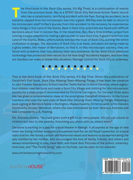 This is the third book of the Sock City series, It's Big Time. Since the publication of Christine's first book, Sock City: Missing Town-Missing Things, it has been her pleasure to visit Franklin Elementary School teacher Tasha Hatten in North Carolina, where eighty-four children read her book and made a Sock City Village and clothing for this microscopic society for a class project recommended by Christine Carrington. For the past three years she has given a comprehension class at the prestigious Campbell University to the future teachers who read the hard copy of Sock City: Missing Town-Missing Things. Following a book signing at Barnes & Noble in Burlington, Massachusetts, Christine went to the Danvers Community Access Television, where she was interviewed by host Veronica Andrews and was compared to J. K. Rowling. Ms. Andrews stated, "You have given such a gift to so many people. It's not just a book to children but also to the parents. Everything you share with us, others learn." Christine is working on a play for a local theater in Raleigh. It all started at the age of nine when her loving mother swapped a household item for an old Royal typewriter on a local radio station. Her books contain old-fashioned values and lessons to be learned along the way instilled by her mother, who encouraged the love of family, friends, and others and always remembering to pray, have faith, and thank God. Pictures of the school, university, interview, and "The Firefly Song," also on YouTube, can be seen on her website: www.christinecarringtonsockcity.com