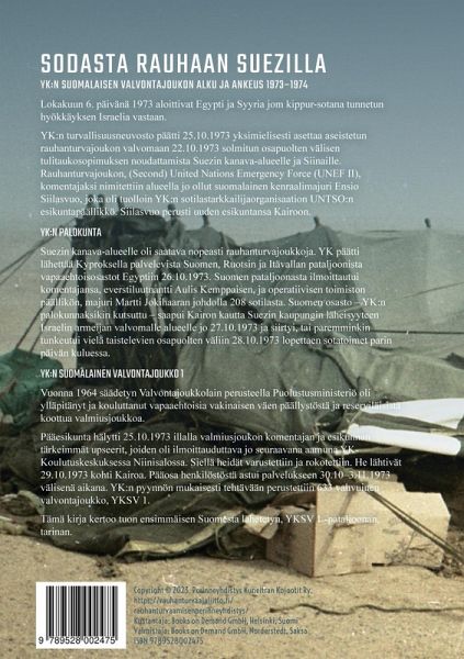 SODASTA RAUHAAN SUEZILLA YK:n suomalaisen valvontajoukon alku ja ankeus 1973-1974 Lokakuun 6. päivänä 1973 aloittivat Egypti ja Syyria jom kippur-sotana tunnetun hyökkäyksen Israelia vastaan. YK:n turvallisuusneuvosto päätti 25.10.1973 yksimielisesti asettaa aseistetun rauhanturvajoukon valvomaan 22.10.1973 solmitun osapuolten välisen tulitaukosopimuksen noudattamista Suezin kanava-alueelle ja Siinaille. Rauhanturvajoukon, (Second) United Nations Emergency Force, UNEF II, komentajaksi nimitettiin alueella jo ollut suomalainen kenraalimajuri Ensio Siilasvuo, joka oli tuolloin YK:n sotilastarkkailijaorganisaation UNTSO:n esikuntapäällikkö. Siilasvuo perusti uuden esikuntansa Kairoon. YK:n palokunta Suezin kanava-alueelle oli saatava nopeasti rauhanturvajoukkoja. YK päätti lähettää Kyproksella palvelevista Suomen, Ruotsin ja Itävallan pataljoonista vapaaehtoisosastot Egyptiin 26.10.1973. Suomen pataljoonasta ilmoittautui komentajansa, everstiluutnantti Aulis Kemppaisen, ja operatiivisen toimiston päällikön, majuri Martti Jokihaaran johdolla 208 sotilasta. Suomen osasto - YK:n palokunnaksikin kutsuttu - saapui Kairon kautta Suezin kaupungin läheisyyteen Israelin armeijan valvomalle alueelle jo 27.10.1973 ja siirtyi, tai paremminkin tunkeutui vielä taistelevien osapuolten väliin 28.10.1973 lopettaen sotatoimet parin päivän kuluessa. YK:n Suomalainen valvontajoukko 1 Vuonna 1964 säädetyn Valvontajoukkolain perusteella Puolustusministeriö oli ylläpitänyt ja kouluttanut vapaaehtoisia vakinaisen väen päällystöstä ja reserviläisistä koottua valmiusjoukkoa. Pääesikunta hälytti 25.10.1973 illalla valmiusjoukon komentajan ja esikunnan tärkeimmät upseerit, joiden oli ilmoittauduttava jo seuraavana aamuna YK-Koulutuskeskuksessa Niinisalossa. Siellä heidät varustettiin ja rokotettiin. He lähtivät 29.10.1973 kohti Kairoa. Pääosa henkilöstöstä astui palvelukseen 30.10-3.11.1973 välisenä aikana. YK:n pyynnön mukaisesti tehtävään perustettiin 633 vahvuinen valvontajoukko, YKSV 1. Tämä kirja kertoo tuon ensimmäisen Suomesta lähetetyn, YKSV 1 -pataljoonan, tarinan.
