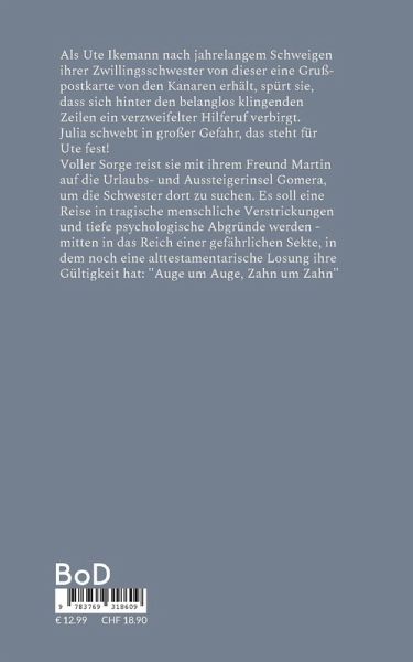 Als Ute Ikemann nach jahrelangem Schweigen ihrer Zwillingsschwester von dieser eine Grußpostkarte von den Kanaren erhält, spürt sie, dass sich hinter den belanglos klingenden Zeilen ein verzweifelter Hilferuf verbirgt. Julia schwebt in großer Gefahr, das steht für Ute fest! Voller Sorge reist sie mit ihrem Freund Martin auf die Urlaubs- und Aussteigerinsel Gomera, um die Schwester dort zu suchen. Es soll eine Reise in tragische menschliche Verstrickungen und tiefe psychologische Abgründe werden - mitten in das Reich einer gefährlichen Sekte, in dem noch eine alttestamentarische Losung ihre Gültigkeit hat: "Auge um Auge, Zahn um Zahn ..."