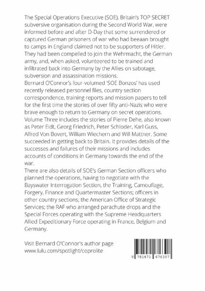 The Special Operations Executive (SOE), Britain's TOP SECRET subversive organisation during the Second World War, were informed before and after D-Day that some surrendered or captured German prisoners of war who had been brought to camps in England claimed not to be supporters of Hitler. They had been compelled to join the Wehrmacht, the German army, and, when asked, volunteered to be trained and infiltrated back into Germany by the Allies on sabotage, subversion and assassination missions. Bernard O'Connor's four-volumed 'SOE Bonzos' has used recently released personnel files, country section correspondence, training reports and mission papers to tell for the first time the stories of over fifty anti-Nazis who were brave enough to return to Germany on secret operations. Volume Three includes the stories of Pierre Dehe, also known as Peter Eidt, Georg Friedrich, Peter Schloder, Karl Guss, Alfred Von Bovert, William Wiechern and Will Mattner. Some succeeded in getting back to Britain. It provides details of the successes and failures of their missions and includes accounts of conditions in Germany towards the end of the war. There are also details of SOE's German Section officers who planned the operations, having to negotiate with the Bayswater Interrogation Section, the Training, Camouflage, Forgery, Finance and Quartermaster Sections; officers in other country sections; the American Office of Strategic Services; the RAF who arranged parachute drops and the Special Forces operating with the Supreme Headquarters Allied Expeditionary Force operating in France, Belgium and Germany.