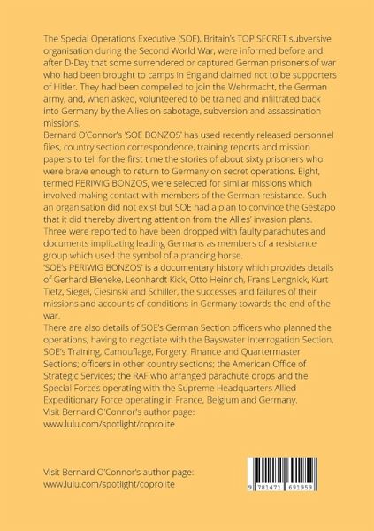 The Special Operations Executive (SOE), Britain's TOP SECRET subversive organisation during the Second World War, were informed before and after D-Day that some surrendered or captured German prisoners of war who had been brought to camps in England claimed not to be supporters of Hitler. They had been compelled to join the Wehrmacht, the German army, and, when asked, volunteered to be trained and infiltrated back into Germany by the Allies on sabotage, subversion and assassination missions. Bernard O'Connor's 'SOE BONZOS' has used recently released personnel files, country section correspondence, training reports and mission papers to tell for the first time the stories of about sixty prisoners who were brave enough to return to Germany on secret operations. Eight, termed PERIWIG BONZOS, were selected for similar missions which involved making contact with members of the German resistance. Such an organisation did not exist but SOE had a plan to convince the Gestapo that it did thereby diverting attention from the Allies' invasion plans. Three were reported to have been dropped with faulty parachutes and documents implicating leading Germans as members of a resistance group which used the symbol of a prancing horse. 'SOE's PERWIG BONZOS' is a documentary history which provides details of Gerhard Bieneke, Leonhardt Kick, Otto Heinrich, Frans Lengnick, Kurt Tietz, Siegel, Ciesinski and Schiller, the successes and failures of their missions and accounts of conditions in Germany towards the end of the war. There are also details of SOE's German Section officers who planned the operations, having to negotiate with the Bayswater Interrogation Section, SOE's Training, Camouflage, Forgery, Finance and Quartermaster Sections; officers in other country sections; the American Office of Strategic Services; the RAF who arranged parachute drops and the Special Forces operating with the Supreme Headquarters Allied Expeditionary Force operating in France, Belgium and Germany. Visit Bernard O'Connor's author page: www.lulu.com/spotlight/coprolite