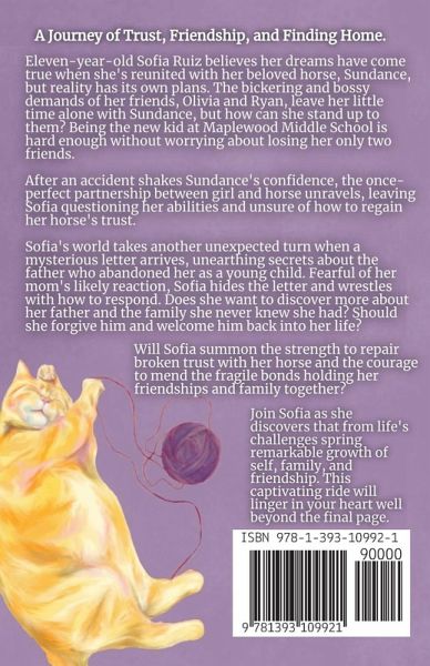 A Journey of Trust, Friendship, and Finding Home. Eleven-year-old Sofia Ruiz believes her dreams have come true when she's reunited with her beloved horse, Sundance, but reality has its own plans. The bickering and bossy demands of her friends, Olivia and Ryan, leave her little time alone with Sundance, but how can she stand up to them? Being the new kid at Maplewood Middle School is hard enough without worrying about losing her only two friends. After an accident shakes Sundance's confidence, the once-perfect partnership between girl and horse unravels, leaving Sofia questioning her abilities and unsure of how to regain her horse's trust. Sofia's world takes another unexpected turn when a mysterious letter arrives, unearthing secrets about the father who abandoned her as a young child. Fearful of her mom's likely reaction, Sofia hides the letter and wrestles with how to respond. Does she want to discover more about her father and the family she never knew she had? Should she forgive him and welcome him back into her life? Will Sofia summon the strength to repair broken trust with her horse and the courage to mend the fragile bonds holding her friendships and family together? Join Sofia as she discovers that from life's challenges spring remarkable growth of self, family, and friendship. This captivating ride will linger in your heart well beyond the final page.
