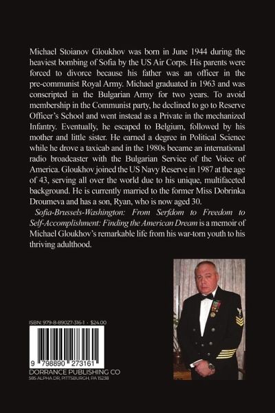Sofia-Brussels-Washington: From Serfdom to Freedom to Self-Accomplishment: Finding the American Dream is a memoir of Michael Gloukhov's remarkable life from his war-torn youth to his thriving adulthood. Michael Stoianov Gloukhov was born in June 1944 during the heaviest bombing of Sofia by the US Air Corps. His parents were forced to divorce because his father was an officer in the pre-communist Royal Army. Michael graduated in 1963 and was conscripted in the Bulgarian Army for two years. To avoid membership in the Communist party, he declined to go to Reserve Officer's School and went instead as a Private in the mechanized Infantry. Eventually, he escaped to Belgium, followed by his mother and little sister. He earned a degree in Political Science while he drove a taxicab and in the 1980s became an international radio broadcaster with the Bulgarian Service of the Voice of America. Gloukhov joined the US Navy Reserve in 1987 at the age of 43, serving all over the world due to his unique, multifaceted background. He is currently married to the former Miss Dobrinka Droumeva and has a son, Ryan, who is now aged 30.