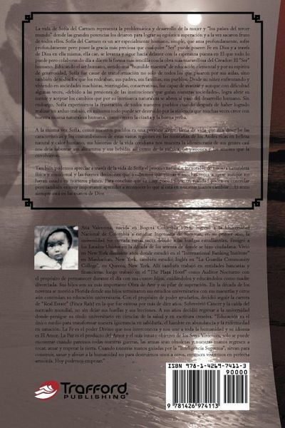 Resumen: La vida de Sofía del Carmen representa la problemática y desarrollo de la mujer y "los países del tercer mundo" donde las grandes potencias los dejaron para lograr su egoistica superación y a la vez sacaron fruto de todos ellos. Sofía del Carmen es un ser especialmente humano, simple, que ama profundamente, sufre profundamente pero posee la gracia más preciosa que cualquier "Ser" puede poseer: Fe en Dios y a través de Dios en ella misma, ella cae, se levanta y sigue hacia delante con la esperanza puesta en El que todo lo puede pero colaborando día a día en la forma más sencilla con la obra más maravillosa del Creador: El "Ser" humano. Educando el ser humano, siendo una "humilde maestra" de educación elemental y por su espíritu de generosidad, Sofía fue cause de transformación no solo de todos los que pasaron por sus aulas, sino también de todos los que los rodeaban, sus padres, sus familias, sus pueblos. Desde su niñez enfrentando y viviendo en sociedades machistas, restringidas, conservativas, fue capaz de avanzar y aunque con dificultad algunas veces, -debido a las presiones de las instituciones que guían nuestras sociedades-, logra abrir su mente y aceptar los cambios que por su intrínseca naturaleza se abren al paso del desarrollo humano. Sin embargo, Sofía experimenta la frustración de todos nuestros pueblos cuando después de haber logrado realizar un arduo trabajo, en minutos todo puede ser destruido por la violencia que muchas veces crece con nuestra misma naturaleza humana, como crecen la cizaña y la buena yerba. A la misma vez Sofía, como nuestros pueblos es una persona alegre, llena de vida que nos describe las características y los costumbrismos de estas vastas regiones en las montañas de los Andes ricas en belleza natural y calor humano, sus historias de la vida cotidiana nos muestra la idiosincrasia de sus gentes casi nos deja saborear sus alimentos y sus bebidas así como de la música, las pasiones y los amores que la envolvieron. También podemos apreciar a través de la vida de Sofía el proceso natural e inexorable de nuestra naturaleza física y emocional y las fuertes decisiones que tendremos que tomar y muchas veces aceptar aunque no hayan estado en nuestros planes. Para concluir que es muy poco lo que en realidad podemos controlar pero también es muy importante aprender a reconocer lo que sí está en nuestras manos cambiar...El resto siempre está en las manos de Dios