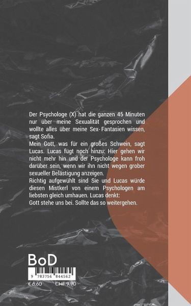 Der Psychologe (X) hat die ganzen 45 Minuten nur über meine Sexualität gesprochen und wollte alles über meine Sexfantasien wissen, sagt Sofia.Mein Gott, was für ein großes Schwein, sagt Lucas. Lucas fügt noch hinzu: Hier gehen wir nicht mehr hin und der Psychologe kann froh darüber sein, wenn wir ihn nicht wegen grober sexueller Belästigung anzeigen.Richtig aufgewühlt sind Sie, und Lucas würde diesen Mistkerl von einem Psychologen am liebsten gleich umhauen. Lucas denkt: Gott stehe uns bei. Sollte das so weitergehen.