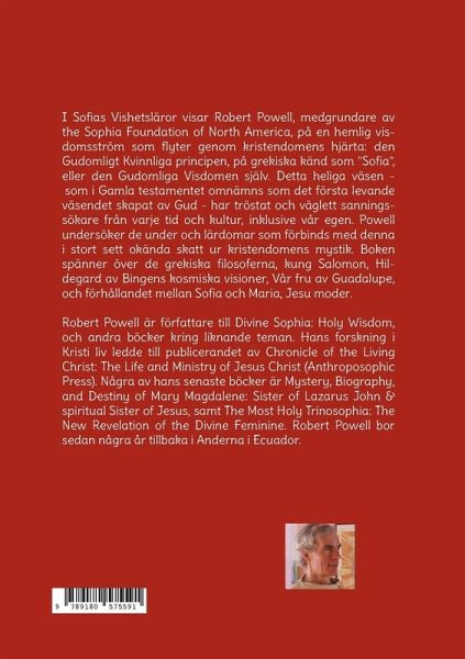 Sofias Vishetsläror Det Gudomligt Kvinnligas framträdande i vår tid Robert Powell, PhD I Sofias Vishetsläror visar Robert Powell, medgrundare av the Sophia Foundation of North America, på en hemlig visdomsström som flyter genom kristendomens hjärta: den gudomligt kvinnliga principen, på grekiska känd som "Sofia", eller den Gudomliga Visdomen själv. Detta heliga väsen - som i Gamla Testamentet omnämns som det första levande väsendet skapat av Gud - har tröstat och väglett sanningssökare från varje tid och kultur, inklusive vår egen. Powell undersöker de under och lärdomar som förbinds med denna i stort sett okända skatt ur kristendomens mystik. Boken spänner över de grekiska filosoferna, kung Salomon, Hildegard av Bingens kosmiska visioner, Vår fru av Guadalupe, och förhållandet mellan Sofia och Maria, Jesu moder. Robert Powell är författare till Divine Sophia: Holy Wisdom, och andra böcker kring liknande teman. Hans forskning i Kristi liv ledde till publicerandet av Chronicle of the Living Christ: The Life and Ministry of Jesus Christ (Anthroposophic Press). Några av hans senaste böcker är Mystery, Biography, and Destiny of Mary Magdalene: Sister of Lazarus John & spiritual Sister of Jesus, samt The Most Holy Trinosophia: The New Revelation of the Divine Feminine. Robert Powell bor sedan några år tillbaka i Anderna i Ecuador.