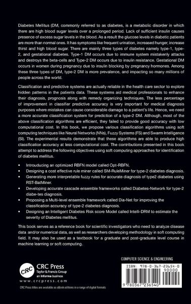 Diabetes Mellitus (DM, commonly referred to as diabetes, is a metabolic disorder in which there are high blood sugar levels over a prolonged period. Lack of sufficient insulin causes presence of excess sugar levels in the blood. As a result the glucose levels in diabetic patients are more than normal ones. It has symptoms like frequent urination, increased hunger, increase thirst and high blood sugar. There are mainly three types of diabetes namely type-1, type-2 and gestational diabetes. Type-1 DM occurs due to immune system mistakenly attacks and destroys the beta-cells and Type-2 DM occurs due to insulin resistance. Gestational DM occurs in women during pregnancy due to insulin blocking by pregnancy harmones. Among these three types of DM, type-2 DM is more prevalence, and impacting so many millions of people across the world. Classification and predictive systems are actually reliable in the health care sector to explore hidden patterns in the patients data. These systems aid, medical professionals to enhance their diagnosis, prognosis along with remedy organizing techniques. The less percentage of improvement in classifier predictive accuracy is very important for medical diagnosis purposes where mistakes can cause a lot of damage to patient's life. Hence, we need a more accurate classification system for prediction of type-2 DM. Although, most of the above classification algorithms are efficient, they failed to provide good accuracy with low computational cost. In this book, we proposed various classification algorithms using soft computing techniques like Neural Networks (NNs), Fuzzy Systems (FS) and Swarm Intelligence (SI). The experimental results demonstrate that these algorithms are able to produce high classification accuracy at less computational cost. The contributions presented in this book shall attempt to address the following objectives using soft computing approaches for identification of diabetes mellitus. Introuducing an optimized RBFN model called Opt-RBFN. Designing a cost effective rule miner called SM-RuleMiner for type-2 diabetes diagnosis. Generating more interpretable fuzzy rules for accurate diagnosis of type2 diabetes using RST-BatMiner. Developing accurate cascade ensemble frameworks called Diabetes-Network for type-2 diabetes diagnosis. Proposing a Multi-level ensemble framework called Dia-Net for improving the classification accuracy of type-2 diabetes diagnosis. Designing an Intelligent Diabetes Risk score Model called Intelli-DRM estimate the severity of Diabetes mellitus. This book serves as a reference book for scientific investigators who need to analyze disease data and/or numerical data, as well as researchers developing methodology in soft computing field. It may also be used as a textbook for a graduate and post graduate level course in machine learning or soft computing.