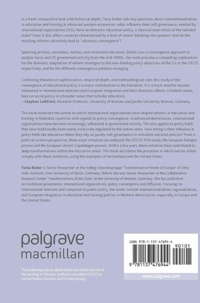 This book examines the extent to which international organizations have shaped reforms in education and training in federalist countries with regards to policy convergence. In advanced democracies, international organizations have become increasingly influential in government activity. This also applies to policy fields that have traditionally been nearly exclusively regulated by the nation-state. How strong is their influence in policy fields like education where they rely on purely soft governance to stimulate national policies? From a political science perspective, three major initiatives are analyzed: the OECD's PISA study, the European Bologna process and the European Union's Copenhagen process. Within a few years, these initiatives have contributed to deep transformations within the education arena. This book elucidates the processes in which nation-states comply with these initiatives, using the examples of Switzerland and the United States. div>