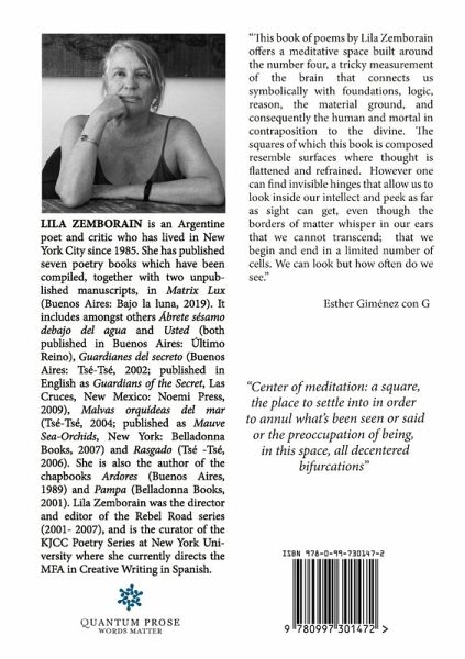 "This book of poems by Lila Zemborain offers a meditative space built around the number four, a tricky measurement of the brain that connects us symbolically with foundations, logic, reason, the material ground, and consequently the human and mortal in contraposition to the divine. The squares of which this book is composed resemble surfaces where thought is flattened and refrained. However one can find invisible hinges that allow us to look inside our intellect and peek as far as sight can get, even though the borders of matter whisper in our ears that we cannot transcend; that we begin and end in a limited numbers of cells. We can look but how often do we see." Esther Giménez con G