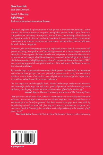 This book explores the phenomenon of soft power in international relations. In the context of current discourses on power and global power shift s, it puts forward a comprehensive taxonomy of soft power and outlines a methodological roadmap for its empirical study. To that end, the book classifies soft power into distinct components - resources, instruments, reception, and outcomes - and identifies relevant indicators for each of these categories. Moreover, the book integrates previously neglected aspects into the concept of soft power, including the significance of (political) personalities. A broad range of historical examples is drawn upon to illustrate the effects of soft power in international relations in an innovative and analytically differentiated way. A central methodological contribution of this book consists in highlighting the value of comparative-historical analysis (CHA) as a promising approach for empirical analyses of the soft power of different actors on the international stage. By introducing a comprehensive taxonomy of soft power, the book offers an innovative and substantiated perspective on a pivotal phenomenon in today's international relations. As the forces of attraction in world politics continue to gain in importance, it provides a valuable asset for a broad readership.
