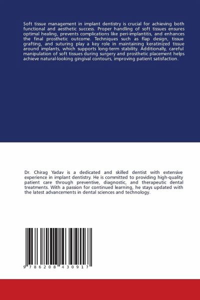 Soft tissue management in implant dentistry is crucial for achieving both functional and aesthetic success. Proper handling of soft tissues ensures optimal healing, prevents complications like peri-implantitis, and enhances the final prosthetic outcome. Techniques such as flap design, tissue grafting, and suturing play a key role in maintaining keratinized tissue around implants, which supports long-term stability. Additionally, careful manipulation of soft tissues during surgery and prosthetic placement helps achieve natural-looking gingival contours, improving patient satisfaction.