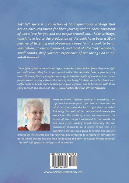 Soft Whispers is a collection of 66 inspirational writings that are an encouragement for life's journey and an encouragement of God's love for you and the people around you. These writings, which have led to the production of the book have been a 28-year+ journey of listening and obedience. I hope for the book to be an inspiration, an encouragement, and most of all a "soft whispers, small shouts, deep waters" experience of our loving God to all. -Ruth Hammond The origins of this unusual book began when Ruth was woken from sleep one night by a soft voice calling her to get up and write. She recounts: 'Words flew into my mind. Pictures filled my imagination. Insights into the depths of emotional hurts that people were carrying entered the core of my being.' It deserves to be placed on a coffee table or beside one's bedside for regular referral, and to be shared with those going through the storms of life. -Julia Martin, Christian Writer Magazine This book will speak to the hearts of its readers.
