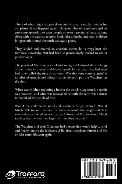 The earth was being destroyed by its inhabitants, and as many as possible of those who realized it left the planet in a massive spaceship fitted out to travel for generations, taking with it all the basics in supplies and information that the travelers would need to start again after the earth thawed from its nuclear winter. An agrarian society, Mir was a place of peace where everyone had a job of their choice to do. The Council (known by all) met every month to see that things went well and the Watchers (two men and two women known only by one another) worked to quietly oversee the safety of Mir. When a young boy saw a friend carrying something impossibly heavy and strange looking on his scooter, he expressed his concern to his friend the blacksmith (a watcher). His friend calmed the boy down, but he himself was concerned, reminded of the time of darkness. Soon two incidents of memory loss and extreme violence occurred, and it was clear that something bad had come to Mir. It took two children and a strange pale little man to literally unearth and solve the problem and return Mir to peace.