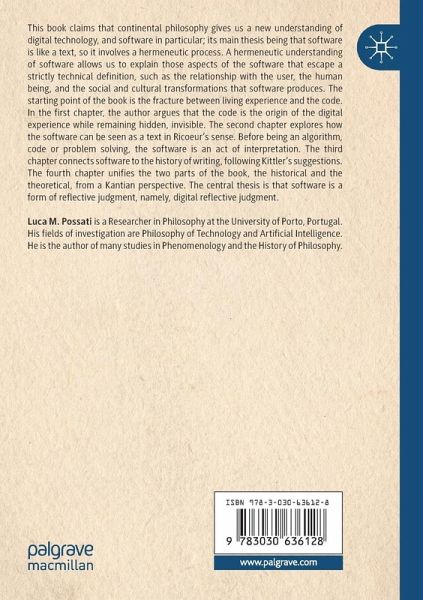 This book claims that continental philosophy gives us a new understanding of digital technology, and software in particular; its main thesis being that software is like a text, so it involves a hermeneutic process. A hermeneutic understanding of software allows us to explain those aspects of software that escape a strictly technical definition, such as the relationship with the user, the human being, and the social and cultural transformations that software produces. The starting point of the book is the fracture between living experience and the code. In the first chapter, the author argues that the code is the origin of the digital experience, while remaining hidden, invisible. The second chapter explores how the software can be seen as a text in Ricoeur's sense. Before being an algorithm, code or problem solving, software is an act of interpretation. The third chapter connects software to the history of writing, following Kittler's suggestions. The fourth chapter unifies the two parts of the book, the historical and the theoretical, from a Kantian perspective. The central thesis is that software is a form of reflective judgment, namely, digital reflective judgement.