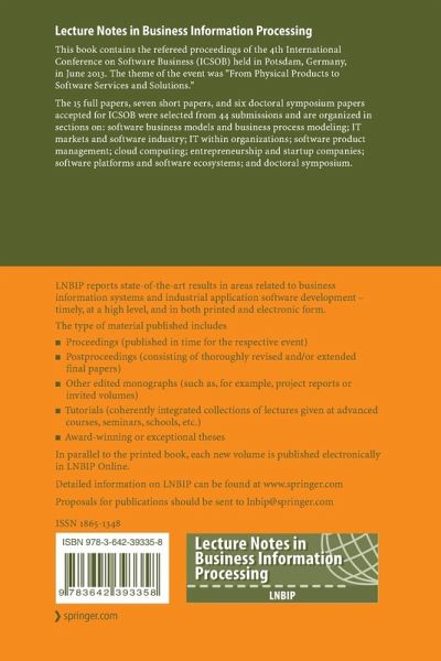This book contains the refereed proceedings of the 4th International Conference on Software Business (ICSOB) held in Potsdam, Germany, in June 2013. The theme of the event was "From Physical Products to Software Services and Solutions."