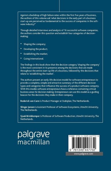 List of Tables List of Figures Acknowledgements Preface Author Information Introduction The Software Start-up Decision Model The Early-life Decision Model Theoretical Background Stages of Growth Influence of Venture Capital Success Factors in New Ventures and Products The Influence of the Entrepreneur Decision Making Lessons of Software Entrepreneurs AFAS Customer Participation Sessions Scoping and Focus Licensing Consultancy Other Wrong Decisions Summary DBS Approaching Software Vendors Changing Company Focus Extending Product Range Wrong Decisions Summary Noldus Information Technology Don't Limit Yourself to the Start Niche Being Open to Inventions from Others Opening Offices Abroad Community Building Wrong Decisions Summary Exact Vision Cash Flow Technology Choices Focus on Marketing Overcoming Problems Other Wrong Decisions Summary Stabiplan Market Emergence and Vision Introduce a Lite Version Taking Over the Biggest Competitor Focus Redesigning the Software Other Wrong Decisions Summary Sofon Standard software Internationally Applicable Affiliation with Complementary Products Other Wrong Decisions Summary GX Software Focus Partnering Strategy Communication Internationalization Other Wrong Decisions Summary Pallas Athena Focusing on Case Management versus Workflow Management Becoming a Software Company Global Orientation Product Acquisition and Product Integration Transforming the Company Structure Other Wrong Decisions Summary ORTEC Starting Product Development Internationalization Other Wrong Decisions Summary E-office Starting with a Dream Company Structure Mobile Human Behaviour Consultancy Start using Google Products How to Make Decisions Wrong Decisions Summary ChipSoft Management-by-event Product Choices Human Resources Other Wrong Decisions Summary Syntess Software Starting and Finding a Dealer Having a Goal Extra Office Company Culture Other Wrong Decisions Summary Planon Focusing on Software and Facility Management Become Market Leader Internationalization Product Positioning Standardize the Implementation Method Wrong Decisions Summary Ultimo Software Solutions Maintenance Management and Flexibility Focus Switching Database Systems Widening and Deepening of the Product Company Culture Other Wrong Decisions Summary Centric The Start of Centric Buying a Posting Company Rapid Expansion Partitioning the Company Other Wrong Decisions Summary UNIT4 Focus on a Product Strategy Standardized Maintenance Balancing Short Term Decisions with Long Term Decisions Going Public Other Wrong Decisions Summary Decision Categories Shaping the Company Developing the Product Establishing the Market Going International What can be Learned from the Decision Categories The Early-life Decision Model for Software Entrepreneurs Decision Analysis Business Model Canvas Managerial Growth Challenge Conceptualization for Small Software Firms Discussion Conclusion References Appendix - Early-life Decisions Overview