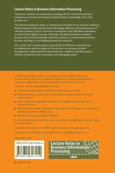 This book contains the refereed proceedings of the Third International Conference on Software Business (ICSOB) held in Cambridge, MA, USA, in June 2012. The software business refers to commercial activities in the software industry, aimed at generating revenues from the design, delivery, and maintenance of software products and IT services to enterprises and individual customers, as well as from digital content. Although this business shares common features with other knowledge-intensive markets, it carries many inherent features making it a challenging domain for research. The 20 full and 10 short papers accepted for ICSOB were selected from 60 submissions and are organized in sections on software product management, organizational transformation, industry transformation, software platforms and ecosystems, and emerging trends.