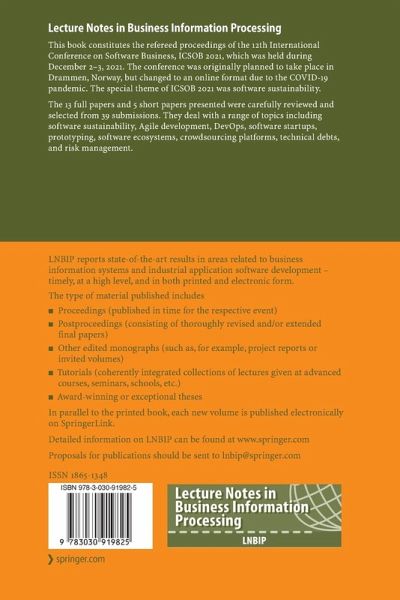 This book constitutes the refereed proceedings of the 12th International Conference on Software Business, ICSOB 2021, which was held during December 2-3, 2021. The conference was originally planned to take place in Drammen, Norway, but changed to an online format due to the COVID-19 pandemic. The special theme of ICSOB 2021 was software sustainability. The 13 full papers and 5 short papers presented were carefully reviewed and selected from 39 submissions. They deal with a range of topics including software sustainability, Agile development, DevOps, software startups, prototyping, software…mehr