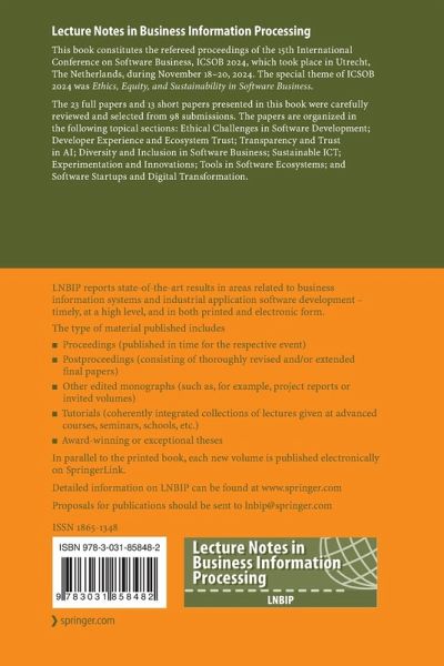 The 23 full papers and 13 short papers presented in this book were carefully reviewed and selected from 98 submissions. The papers are organized in the following topical sections: Ethical Challenges in Software Development; Developer Experience and Ecosystem Trust; Transparency and Trust in AI; Diversity and Inclusion in Software Business; Sustainable ICT; Experimentation and Innovations; Tools in Software Ecosystems; and Software Startups and Digital Transformation.