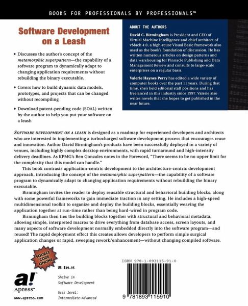 Software Development on a Leash is designed as a roadmap for experienced developers and architects who are interested in implementing a turbocharged software development process that encourages reuse and innovation. Author David Birmingham's products have been successfully deployed in a variety of venues, including highly complex desktop environments, with rapid turnaround and high-intensity delivery deadlines.