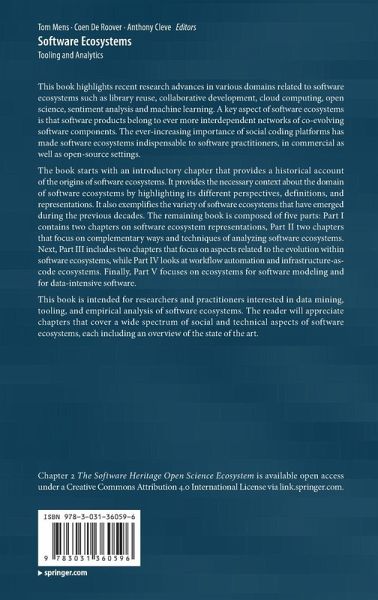 The book starts with an introductory chapter that provides a historical account of the origins of software ecosystems. It provides the necessary context about the domain of software ecosystems by highlighting its different perspectives, definitions, and representations. It also exemplifies the variety of software ecosystems that have emerged during the previous decades. The remaining book is composed of five parts: Part I contains two chapters on software ecosystem representations, Part II two chapters that focus on complementary ways and techniques of analyzing software ecosystems. Next, Part III includes two chapters that focus on aspects related to the evolution within software ecosystems, while Part IV looks at workflow automation and infrastructure-as-code ecosystems. Finally, Part V focuses on ecosystems for software modeling and for data-intensive software.