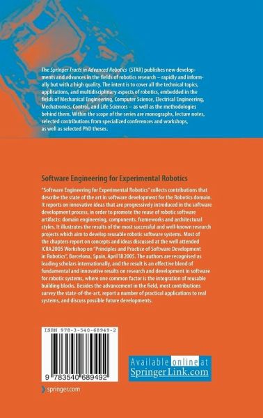 "Software Engineering for Experimental Robotics" collects contributions that describe the state of the art in software development for the Robotics domain. It reports on innovative ideas that are progressively introduced in the software development process, in order to promote the reuse of robotic software artifacts: domain engineering, components, frameworks and architectural styles. It illustrates the results of the most successful and well-known research projects which aim to develop reusable robotic software systems. Most of the chapters report on concepts and ideas discussed at the well attended ICRA2005 Workshop on "Principles and Practice of Software Development in Robotics", Barcelona, Spain, April 18 2005. The authors are recognised as leading scholars internationally, and the result is an effective blend of fundamental and innovative results on research and development in software for robotic systems, where one common factor is the integration of reusable building blocks. Besides the advancement in the field, most contributions survey the state of the art, report a number of practical applications to real systems, and discuss possible future developments.