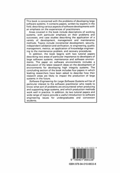 These proceedings include tutorials and papers presented at the Sixth CSR Confer ence on the topic of Large Software Systems. The aim of the Conference was to identify solutions to the problems of developing and maintaining large software systems, based on approaches which are currently being undertaken by software practitioners. These proceedings are intended to make these solutions more widely available to the software industry. The papers from software practitioners describe: - important working systems, highlighting their problems and successes; - techniques for large system development and maintenance, including project management, quality management, incremental delivery, system security, in dependent V & V, and reverse engineering. In addition, academic and industrial researchers discuss the practical impact of current research in formal methods, object-oriented design and advanced environ ments. The keynote paper is provided by Professor Brian Warboys of ICL and the University of Manchester, who masterminded the development of the ICL VME Operating System, and the production of the first database-driven software en gineering environment (CADES). The proceedings commence with reports of the two tutorial sessions which preceded the conference: - Professor Keith Bennett of the Centre for Software Maintenance at Durham University on Software Maintenance; - Professor John McDermid of the University of York on Systems Engineering Environments for High Integrity Systems. The remaining papers deal with reports on existing systems (starting with Professor Warboys' keynote paper), approaches to large systems development, methods for large systems maintenance and the expected impact of current research.