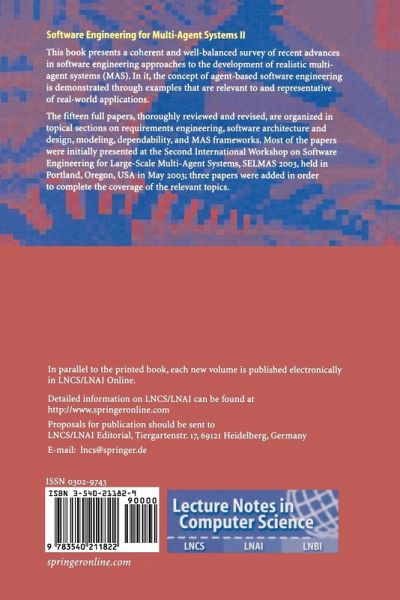 Advances in networking technology have revitalized the investigation of agent technologyasapromisingparadigmforengineeringcomplexdistributedsoftware systems. Agent technology has been applied to a wide range of application - mains, including e-commerce, human-computer interfaces, telecommunications, and software assistants. Multi-agent systems (MASs) and their underlying t- ories provide a more natural support for ensuring important properties such as autonomy, mobility, environment heterogeneity, organization, openness, and intelligence. As a consequence, agent-based systems are likely to provide new - proaches to dealing with the complexity of developing and maintaining modern software. However, developing robust large-scale agent-based systems will - quire new software engineering approaches. There are currently many methods and techniques for working with individual agents or with systems built using only a few agents. Unfortunately, agent-based software engineering is still in its infancy and existing software engineering approaches are unable to cope with large MASs. The complexity associated with a large MAS is considerable. When a huge number of agents interact over heterogeneous environments, various phenomena occur which are not as easy to capture as when only a few agents are working together. As the multiple software agents are highly collaborative and operate in networked environments, they have to be context-aware and deal with - vironment uncertainty. This makes their coordination and management more di?cult and increases the likelihood of exceptional situations, such as security holes, privacy violations, and unexpected global e?ects. Moreover, as users and softwareengineersdelegatemoreautonomytotheirMASs,andputmoretrustin their results, new concernsarise in real-life applications.
