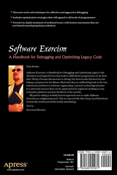YOU HAVE TO OWN THIS BOOK! Software Exorcism: A Handbook for Debugging and Optimizing Legacy Code takes an unflinching, no bulls$ look at behavioral problems in the software engineering industry, shedding much-needed light on the social forces that make it difficult for programmers to do their job. Do you have a co-worker who perpetually writes bad code that you are forced to clean up? This is your book. While there are plenty of books on the market that cover debugging and short-term workarounds for bad code, Reverend Bill Blunden takes a revolutionary step beyond them by bringing our attention to the underlying illnesses that plague the software industry as a whole.