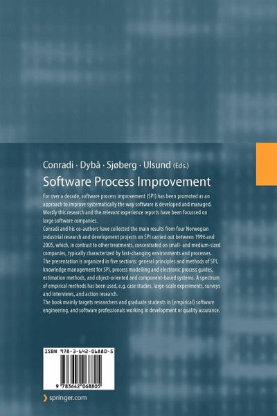 Conradi and his co-authors have collected the main results from four Norwegian industrial research and development projects on SPI carried out between 1996 and 2005, which, in contrast to other treatments, concentrated on small- and medium-sized companies, typically characterized by fast-changing environments and processes. The presentation is organized in five sections: general principles and methods of SPI, knowledge management for SPI, process modelling and electronic process guides, estimation methods, and object-oriented and component-based systems. A spectrum of empirical methods has been used, e.g. case studies, large-scale experiments, surveys and interviews, and action research.