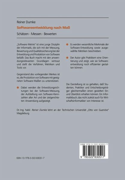 "Software-Metrie" ist eine junge Disziplin der Informatik, die sich mit der Messung, Bewertung und Qualtiätssicherung bei der Entwicklung und Produktion von Software befaßt. Das Buch macht mit den anwendungsrelevanten Grundlagen vertraut und stellt die Verfahren, Metriken und Tools vor. Gegenstand des vorliegenden Werkes ist es, die Produktion von Software mit geeigneten Software-Maßen zu unterstützen. Dabei ist die Darstellung so gehalten, daß Studenten, Praktiker und Entscheidungsträger gleichermaßen einen gezielten Ein- und Überblick erhalten können. Ein Informatikbuch, das nicht zuletzt auch für den Wirtschaftsinformatiker von Interesse ist.
