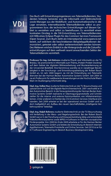 Professor Dr.-Ing. Grit Behrens studierte Physik und Informatik an der TU Breslau. Sie promovierte in Informatik zum Thema "Protein-Protein Docking" auf dem Gebiet der digitalen Bildverarbeitung und Mustererkennung an der Universität Bielefeld. Ihre Kenntnisse wandte sie in vierjähriger Berufstätigkeit in der Forschungs- und Entwicklungsabteilung der Robert Bosch GmbH an. Im Jahr 2000 begann sie mit der Entwicklung von Telematikdiensten bei der Harman Becker Automotive Systems GmbH. Seit 2004 ist sie als Professorin für webbasierte Anwendungen an der Hochschule Rhein- Main im Studiengang Informatik tätig. Dipl.-Ing. Volker Kuz studierte Elektrotechnik an der TU Braunschweig und spezialisierte sich auf die digitale Nachrichtentechnik. 2001 wechselte er in den Automotive-Bereich. In der Vorausentwicklung der Harman Becker Automotive Systems GmbH realisierte er Übertragungsprotokolle und Schnittstellen für die interne und externe Kommunikation von Infotainmentsystemen. Unter anderem ist hierbei das CSI (Common Services Interface) entstanden. Seit 2009 arbeitet er bei der operational services GmbH und ist dort maßgeblich am Aufbau des neuen Geschäftsfeldes "Intelligente Verkehrssysteme" beteiligt. Dipl.-Ing. Ralph Behrens studierte Elektrotechnik an der TU Braunschweig mit Vertiefung in der Mess- und Regelungstechnik. Bei der Robert Bosch GmbH war er in der Forschung und Vorausentwicklung tätig und entwickelte Videokonferenzsysteme sowie MPEG-4-Software im Rahmen europäischer Förderprojekte. Von 2000 bis Ende 2009 arbeitete er für die Harman Becker Automotive Systems GmbH und leitete die Entwicklung im Bereich Internet- Applikationen, Telematik-Protokolle und Online Services. Seit 2010 ist er für ICT Software-Engineering im Bereich Business Development tätig.