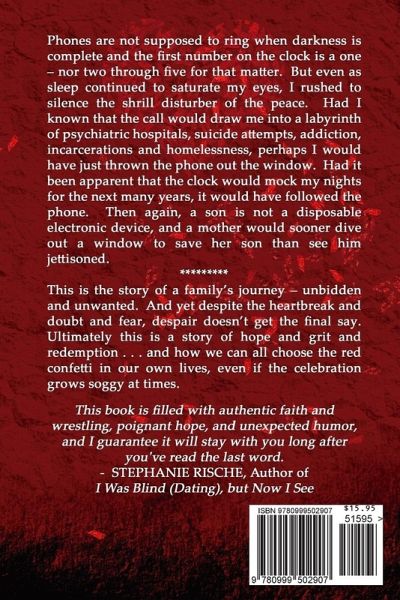 Soggy Red Confetti is the story of a family and those who continually bisect their faltering world as lives are dominated by addiction and mental illness. This true story, told as it was endured, will resonate with those who are and those who love, someone trapped in desperate, relentless, endless and largely hidden pain, that binds them - hand and foot. It does not take long for these sojourners to jettison the idea of a magic bullet cure. Indeed, there may not even exist a realistic hope for a return to their coveted "normal." In their pain, however, nothing is more desirable than knowing that someone else "gets it" and can affirm it really is as bad as they think it is - and perhaps that someone else has outlasted their surreal existence that passes for life. Soggy Red Confetti is raw, and it is real. But ultimately, it is a celebration of life - messy and miraculous - even when the confetti becomes soggy.