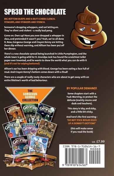 The 9th Book in the Gorgeous George series - a standalone adventure Spr3d the Chocolate - Big bottom burps and a butt-cheek clench. Stingers, and stinkers and stench. Someone's dropping whoppers, and not letting on. They're silent and violent - a really bad pong. Come on. Own up! Have you ever dropped a whopper in class, and pretended it wasn't you? Yeah, we've all done it. Now, Gorgeous George and Crayon Kenny are letting them slip without warning, and Allison has been put off her dinner. There's a new chocolate spread being launched in Little Pumpington, and the whole town is going wild for it. Grandpa Jock has found the scratchiest toilet paper ever invented, and he wants to show the world what you can do with it ( and it's not for wiping bottoms!) Allison's ear has been dripping with blood. George has been eating a face full of mud. And Crayon Kenny's bottom comes down with a thud! There are a couple of really nasty characters who are about to get away with an entire lifetime's worth of bad behaviour. By popular demand, some chapters start with a Yuck Warning, to protect the delicate (mainly mums and dads and teachers). This story is icky, and sicky, and a little bit sticky. And here's the first warning - 'Do not stick boiled eggs up a donkey's bottom!' (this will make sense if you read the book).
