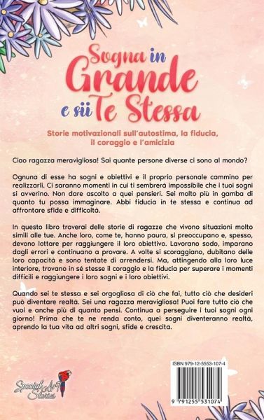 Ciao ragazza meravigliosa! Sai quante persone diverse ci sono al mondo? Ognuna di esse ha sogni e obiettivi e il proprio personale cammino per realizzarli. Ci saranno momenti in cui ti sembrerà impossibile che i tuoi sogni si avverino. Non dare ascolto a quei pensieri. Sei molto più in gamba di quanto tu possa immaginare. Abbi fiducia in te stessa e continua ad affrontare sfide e difficoltà. In questo libro troverai delle storie di ragazze che vivono situazioni molto simili alle tue. Anche loro, come te, hanno paura, si preoccupano e, spesso, devono lottare per raggiungere il loro obiettivo. Lavorano sodo, imparano dagli errori e continuano a provare. A volte si scoraggiano, dubitano delle loro capacità e sono tentate di arrendersi. Ma, attingendo alla loro luce interiore, trovano in sé stesse il coraggio e la fiducia per superare i momenti difficili e raggiungere i loro sogni e i loro obiettivi. Quando sei te stessa e sei orgogliosa di ciò che fai, tutto ciò che desideri può diventare realtà. Sei una ragazza meravigliosa! Puoi fare tutto ciò che vuoi e anche più di quanto pensi. Continua a perseguire i tuoi sogni ogni giorno! Prima che te ne renda conto, quei sogni diventeranno realtà, aprendo la tua vita ad altri sogni, sfide e crescita. Cosa troverai in questo libro: 10 Storie ispiratrici per ragazze sull'autostima, la fiducia, il coraggio e l'amicizia Uno stile di scrittura semplice ed accattivante adatto sia alla lettura condivisa che a quella indipendente Identificazione con i personaggi, che anche se immaginari, sono sempre combinati con temi della vita reale dei bambini Belle Immagini per accompagnare la lettura e stimolare l'immaginazione Morali e Messaggi di Vita con riflessioni e coinvolgimenti nella narrazione Le ragazze amano questo libro perché le aiuta a: Capire l'importanza delle relazioni con i genitori e gli amici Sviluppare la fiducia in sé stessi e nelle proprie capacità Affrontare meglio le situazioni difficili Non arrendersi mai e non lasciarsi scoraggiare da piccoli fallimenti Essere curiosi e seguire le proprie passioni 2 Regali per te che puoi scaricare dal sito di Special Art: Diario dei sogni per bambini (PDF) Frasi motivazionali libro da colorare per bambini (PDF) Clicca su ""compra ora"" e aiuta una ragazza a migliorare la sua autostima e a credere in se stessa! (Una Perfetta Idea Regalo)