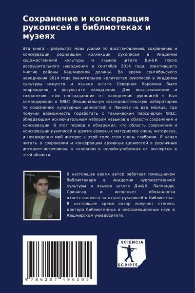 Jeta kniga - rezul'tat moih usilij po wosstanowleniü, sohraneniü i konserwacii redchajshej kollekcii rukopisej w Akademii hudozhestwennoj kul'tury i qzykow shtata Dzh&K posle razrushitel'nogo nawodneniq w sentqbre 2014 goda, ohwatiwshego mnogie rajony Kashmirskoj doliny. Vo wremq sentqbr'skogo nawodneniq 2014 goda znachitel'noe kolichestwo rukopisej w Akademii kul'tury iskusstw i qzykow shtata Sewernaq Karolina bylo powrezhdeno w rezul'tate nawodneniq. Dlq wosstanowleniq i sohraneniq ätih postradawshih ot nawodneniq rukopisej q byl komandirowan w NRLC (Nacional'nuü issledowatel'skuü laboratoriü po sohraneniü kul'turnyh cennostej) w Lakhnau na dwa mesqca, gde poluchil wozmozhnost' porabotat' s tehnicheskim personalom NRLC, obladaüschim isklüchitel'nym naborom nawykow w oblasti sohraneniq i konserwacii. V ätot period q obnaruzhil, chto oblast' sohraneniq i konserwacii rukopisej i drugih arhiwnyh materialow ochen' interesna, i neozhidanno moj interes k ätoj teme stal ochen' glubokim. Ya nachal chitat' o sohranenii i konserwacii arhiwnyh cennostej w razlichnyh internet-istochnikah, w osnownom w onlajn-uchebnikah ot äxpertow w ätoj oblasti.