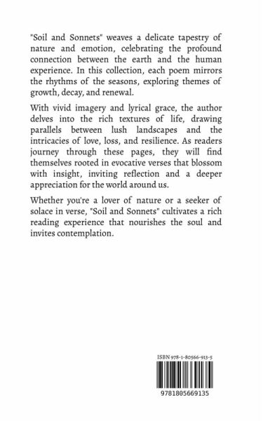 "Soil and Sonnets" weaves a delicate tapestry of nature and emotion, celebrating the profound connection between the earth and the human experience. In this collection, each poem mirrors the rhythms of the seasons, exploring themes of growth, decay, and renewal. With vivid imagery and lyrical grace, the author delves into the rich textures of life, drawing parallels between lush landscapes and the intricacies of love, loss, and resilience. As readers journey through these pages, they will find themselves rooted in evocative verses that blossom with insight, inviting reflection and a deeper appreciation for the world around us. Whether you're a lover of nature or a seeker of solace in verse, "Soil and Sonnets" cultivates a rich reading experience that nourishes the soul and invites contemplation.