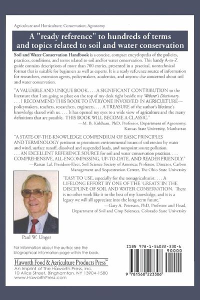Save time and effort with this practical guide to all aspects of water and soil conservation Soil and Water Conservation Handbook is a concise, compact encyclopedia of the policies, practices, conditions, and terms related to soil and/or water conservation. This handy A-to-Z guide contains descriptions of more than 700 entries, presented in a practical, non-technical format that's suitable for beginners as well as experts. It's a ready reference source of information for researchers, extension agents, policymakers, academics, and anyone else concerned about soil and water conservation. Internationally acclaimed soil scientist Dr. Paul Unger has called on his 35 years experience researching the effects of tillage, crop residues, and soil management as well as his observations in more than 40 countries to assemble a resource on soil and water conservation that's concise but comprehensive. Sources for the book's main and secondary entriesmany of which are cross-referencedinclude technical journals, bulletins, reports, farm magazines, commercial leaflets, books, and Internet resources. Soil and Water Conservation Handbook also includes a detailed table of contents and an index, allowing quick and easy access to any entry. Soil and Water Conservation Handbook includes entries that cover: climate characteristics cropping systems and sequences erosion types human factors management issues planting and seeding methods crop residue types and management practices soil and land conditions tillage methods water control practices and much more Soil and Water Conservation Handbook is an invaluable reference for researchers, agricultural extension agents, Natural Resource Conservation Service personnel, educators and students, land managers, and farmers.