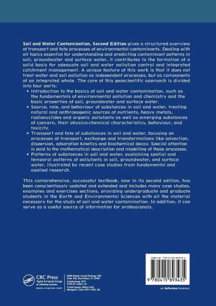 Soil and Water Contamination, Second Edition gives a structured overview of transport and fate processes of environmental contaminants. Dealing with all topics essential for understanding and predicting contaminant patterns in soil, groundwater and surface water, it contributes to the formation of a solid basis for adequate soil and water pollution control and integrated catchment management. A unique feature of this work is that it does not treat water and soil pollution as independent processes, but as components of an integrated whole. The core of this geoscientific approach is divided into four parts: ¿ Introduction to the basics of soil and water contamination, such as the fundamentals of environmental pollution and chemistry and the basic properties of soil, groundwater and surface water. ¿ Source, role, and behaviour of substances in soil and water, treating natural and anthropogenic sources of nutrients, heavy metals, radionuclides and organic pollutants as well as emerging substances of concern, their physico-chemical characteristics, behaviour, and toxicity. ¿ Transport and fate of substances in soil and water, focusing on processes of transport, exchange and transformations like advection, dispersion, adsorption kinetics and biochemical decay. Special attention is paid to the mathematical description and modelling of these processes. ¿ Patterns of substances in soil and water, explaining spatial and temporal patterns of pollutants in soil, groundwater, and surface water, illustrated by recent case studies from fundamental and applied research. This comprehensive, successful textbook, now in its second edition, has been conscientiously updated and extended and includes many case studies, examples and exercises sections, providing undergraduate and graduate students in the Earth and Environmental Sciences with all the material necessary for the study of soil and water contamination. In addition, it can serve as a useful source of information for professionals.