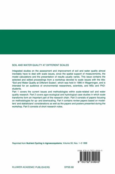 Integrated studies on the assessment and improvement of soil and water quality have to deal almost inevitably with issues of scale, since the spatial support of measurements, the model calculations and the presentation of results usually vary. This book contains the selected and edited proceedings of a workshop devoted to issues of scale entitled: `Soil and Water Quality at Different Scales', which was held in 1996 in Wageningen. It is intended for environmental researchers, scientists and MSc and PhD students. Part 1 covers current issues and methodologies with scale related soil and water quality research. Part 2 covers agroecological and hydrological case studies in which scale transforms form an important part of the research chain. Part 3 consists of papers focusing on methodologies and up and downscaling. Part 4 contains review papers based on modellers' and statisticians' considerations as well as the papers and posters presented during the workshop. Part 5 consists of short research notes.